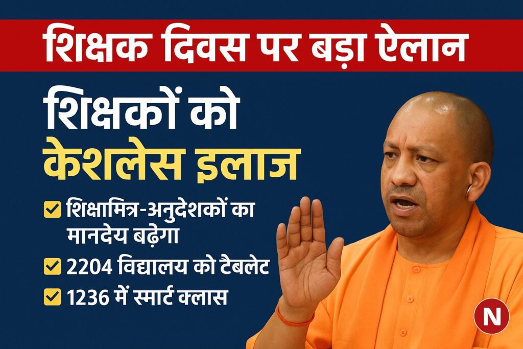 शिक्षक दिवस के अवसर पर मुख्यमंत्री योगी आदित्यनाथ ने शिक्षकों, शिक्षामित्रों और अनुदेशकों को दिवाली से पहले बड़ा तोहफा दिया। राजधानी लखनऊ में आयोजित शिक्षक सम्मान समारोह में सीएम योगी ने घोषणा की कि प्रदेश में शिक्षकों को कैशलेस इलाज की सुविधा मिलेगी। इस योजना से बेसिक, माध्यमिक, वित्त पोषित और अशासकीय विद्यालयों के करीब 9 लाख शिक्षक लाभान्वित होंगे।