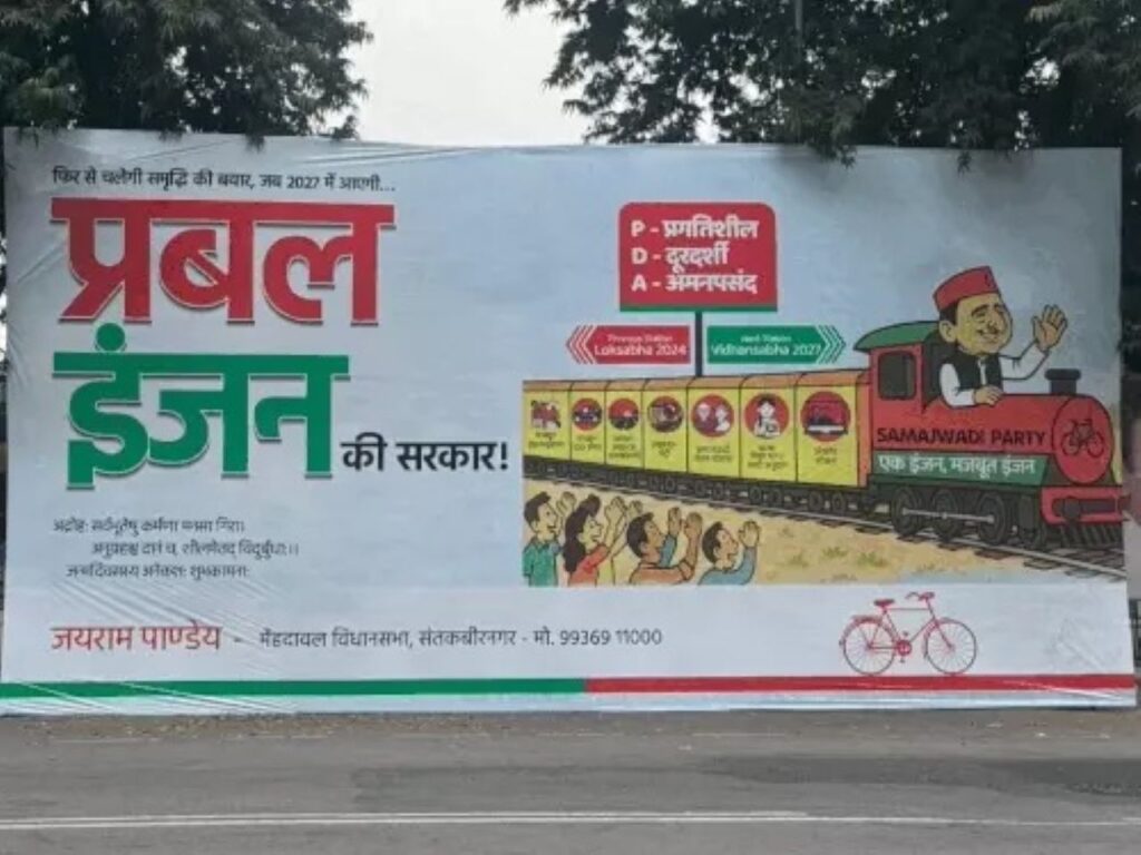 होर्डिंग में लिखा है—“फिर से चलेगी समृद्धि की बयार, जब 2027 में आएगी प्रबल इंजन की सरकार।”
